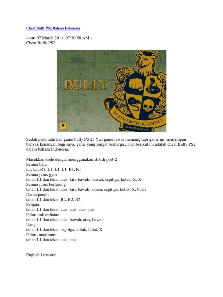 Cheat Bully English - Kunci Jawaban English Pada Game Bully Ps2 : Karena ada banyak keseruan tersendiri di saat memainkannya.